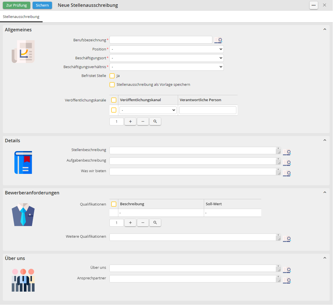 Die Applikation Bewerbermanagement ermöglicht es Ihnen, den gesamten Bewerbungsprozess Ihres Unternehmens digital zu verwalten. Sie können Stellenausschreibungen erstellen und durch das 4-Augen-Prinzip und eine Vorlagenfunktion die Qualität Ihrer Ausschreibungen sicherstellen. Kanäle in Ihrem Unternehmen, die Ausschreibungen pflegen, werden über neue Ausschreibungen informiert und in die Lage versetzt, diese optimal zu bewerben. Über eine Übersicht lässt sich für jede Ausschreibung zentral verwalten, wie viele Bewerbungen für diese eingegangen sind und wie der jeweilige Bearbeitungsstatus ist. Für jede Bewerbung wird der gesamte Bewerbungsprozess von Erfassung, Erstbewertung über eine beliebig festlegbare Anzahl von Interviewauswertungen bis zur Unterschrift abgebildet. Die Erfassungsmaske kann problemlos auf Ihrer Homepage oder in einem Dokument via URL oder für Social-Media eingepflegt werden. Für eine neue Bewerbung kann ein bereits vorgemerkter Kandidat über einen integrierten Kandidatenpool belegt werden.