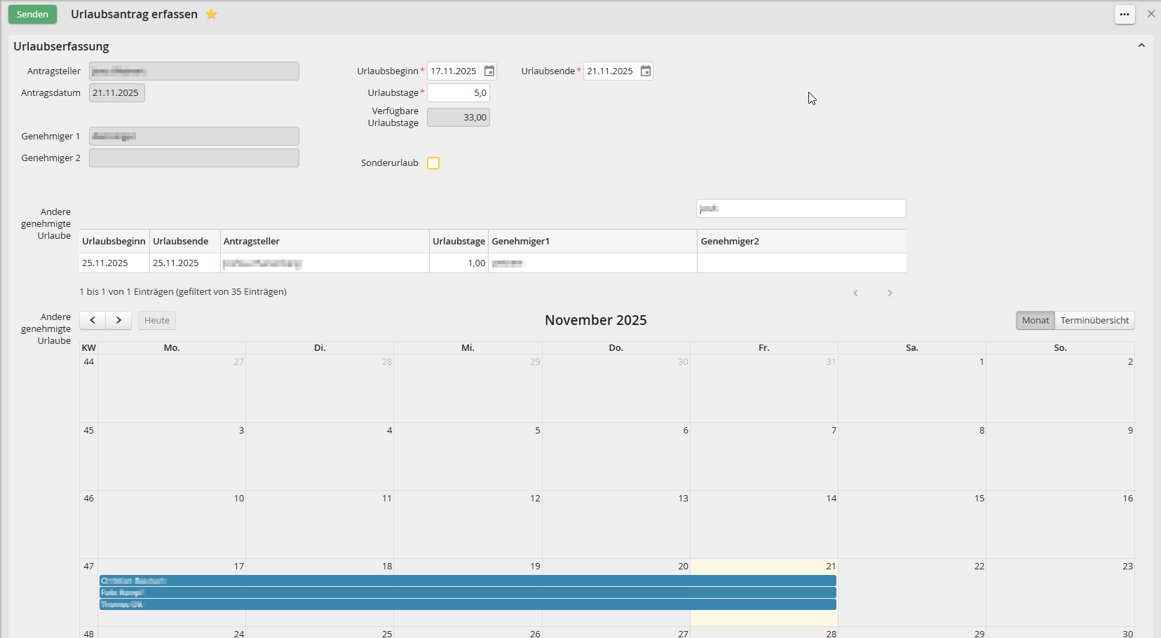 - Eingabe aller relevanten Daten wie Zeitraum, Grund, Sonderurlaub