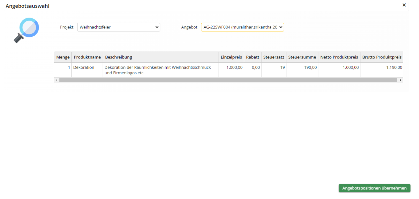 Sollten Sie ein Angebot mit unserer Applikation Angebotserstellung erstellt haben, können Sie die Positionen dieser übernehmen und ggf. anpassen. Ebenso integriert ist auch die Applikation Zeiterfassung, aus welcher Sie passend zum jeweiligen Projekt die erfassten Zeiten aller Mitarbeiter sehen und übernehmen können.