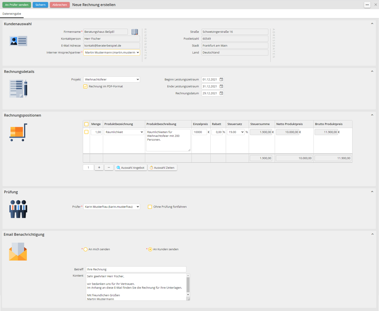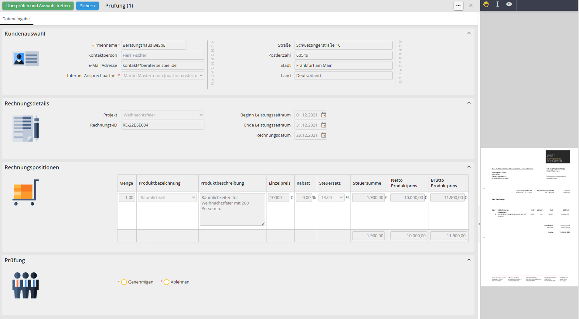 Die Applikation Rechnungserstellung ermöglicht es Ihnen und Ihren Mitarbeitern auf einem schnellen und einfachen Weg eine Rechnung auf Basis einer hinterlegten Vorlage im Firmendesign zu erstellen. Das Hinzufügen der Kundendaten erfordert keine fehleranfällige manuelle Eingabe, sondern ist, dank voll integrierter Kunden-Datenbank, mit nur wenigen Klicks erledigt. Die Produkte der einzelnen Rechnungspositionen lassen sich aus vordefinierten Listen auswählen und befüllen nach der Auswahl automatisch Felder wie den jeweiligen Einzelpreis und den passenden Steuersatz. Nach Prüferauswahl und Freigabe ist Ihre Rechnung erstellt und versandbereit.